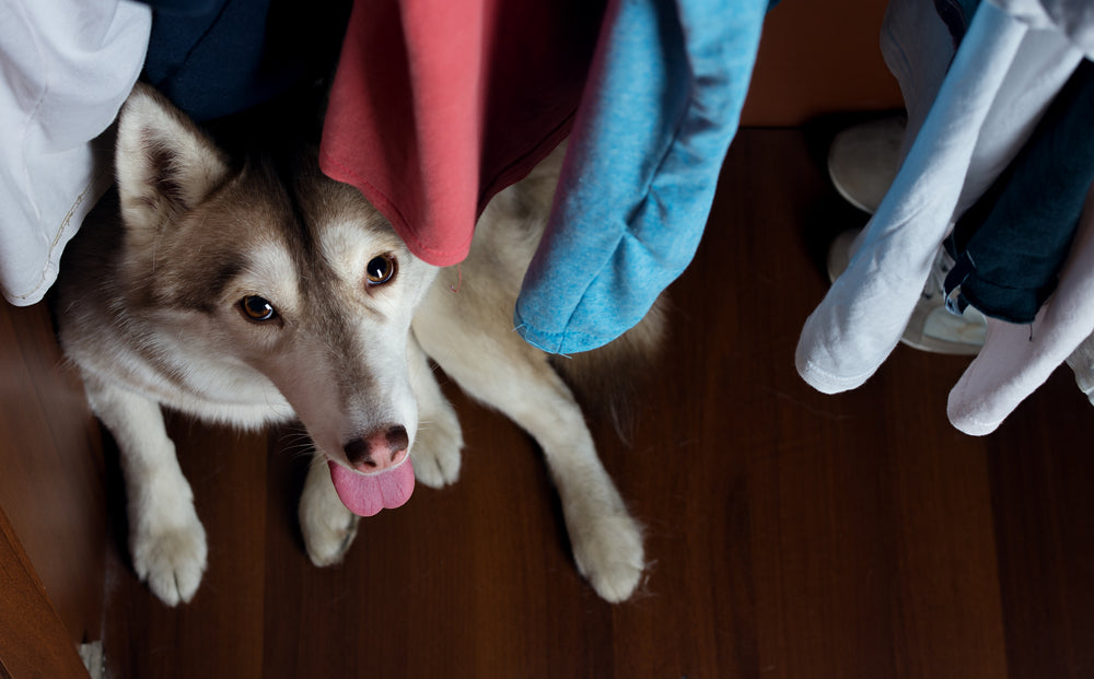 Husky looking up at camera in a closet of clothes
