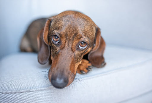 Sad dog laying on couch looking directly into camera