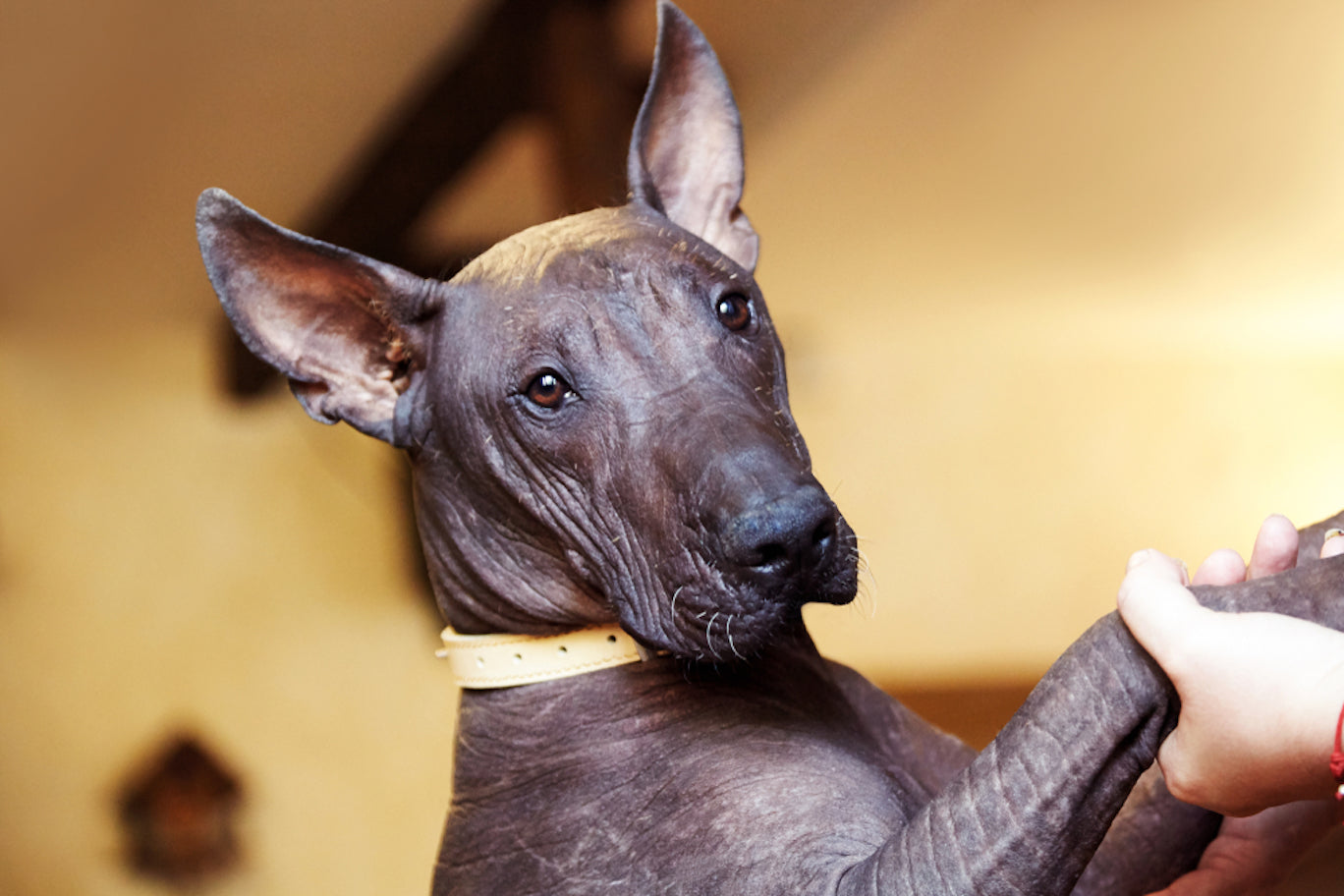Close up of Xolo with a yellow collar  holding hands with owner
