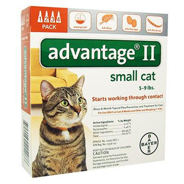Advantage II is a monthly topical flea prevention and treatment for cats over 5 pounds that kills fleas through contact, so they don’t have to bite to die. This non-prescription medication kills fleas, flea eggs, and flea larvae to prevent re-infestations. It starts killing fleas on your cat in 12 hours and is waterproof after 24 hours.